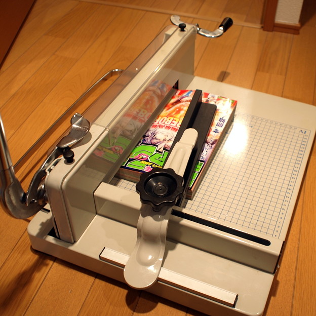 安い中国製の裁断機。噂通り油まみれだったので、軍手とぞうきんでふきふきしました。この裁断機が実物が予想以上に大きかったです。もっと小さいものでもよいかもしれませんが、このクラスがあれば少なくとも普通の本の裁断なら全くイライラすることはありません。僕の場合はジャンプで試し切りしました。