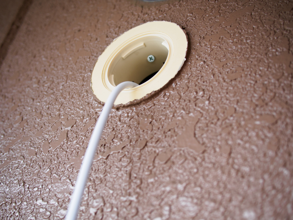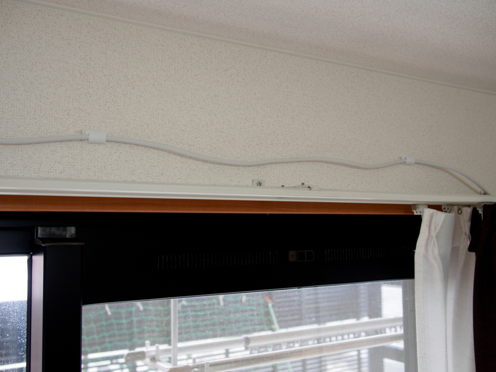 部屋の中では、こんな感じに延長ケーブルを固定して電源まで這わせます