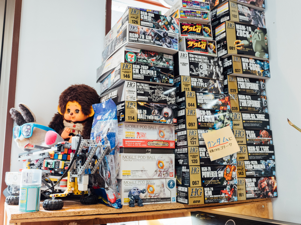 大量のガンプラとモンチッチ