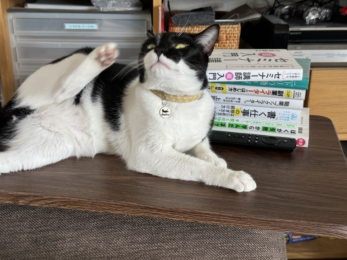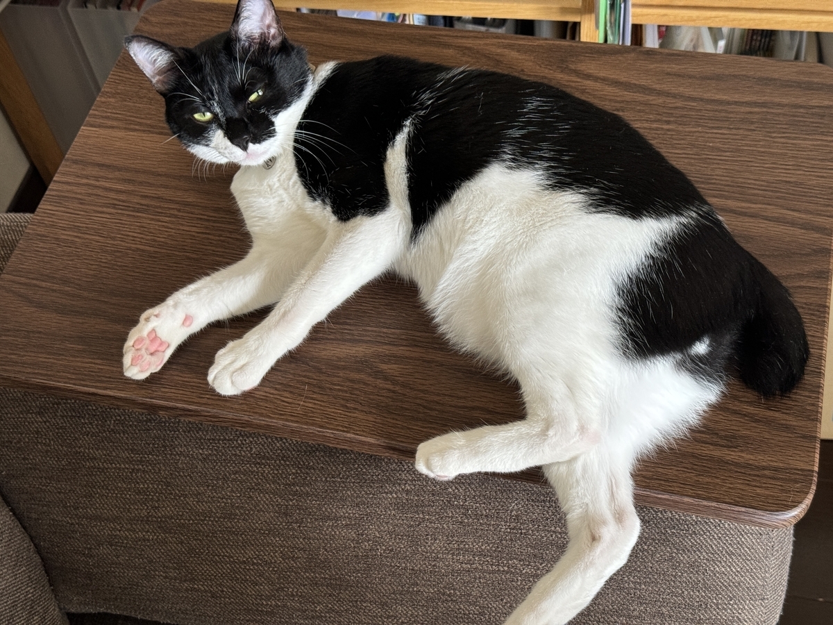ネコちゃんにお伺いを立てながらサイドテーブルを使用しています。